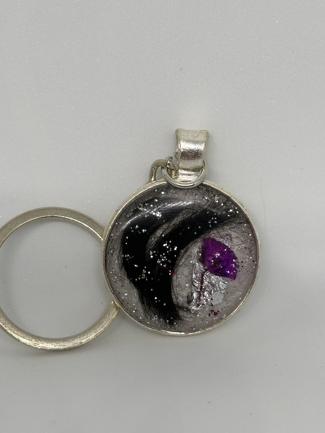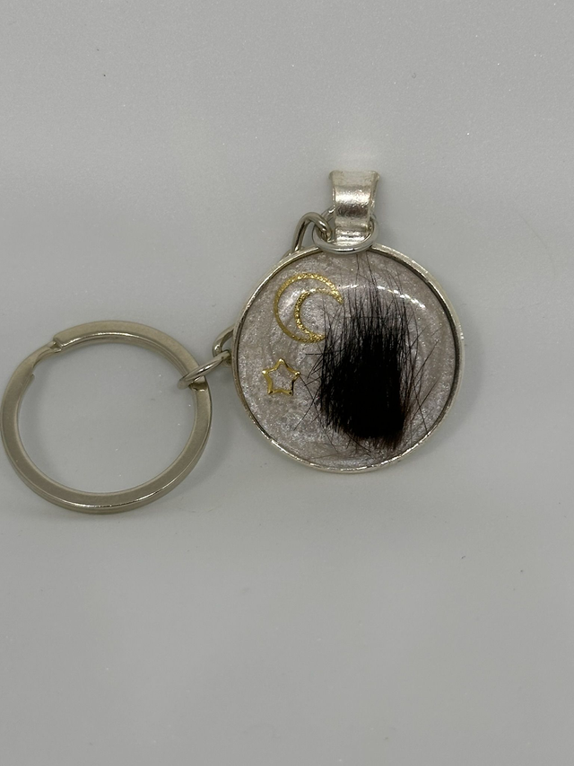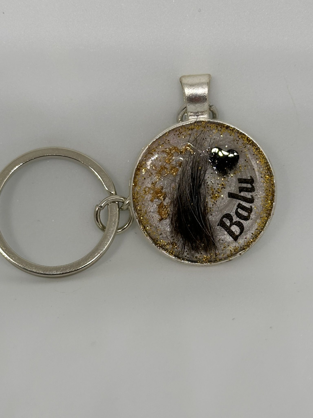 Ein ca. 30 mm runder Schlüsselanhänger, veredelt mit Erbgut deiner Fellnase.